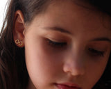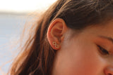 העגילים עשויים מפליז ומצופים זהב איכותי ללא ניקל, בגימור מט. המוטות שנכנסים לאוזן עשויים מכסף, ולכן היפואלרגניים ומגיעים עם סוגרי סיליקון.