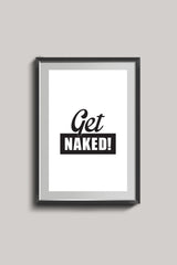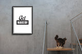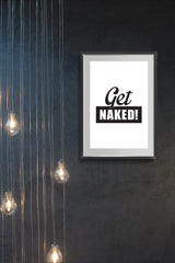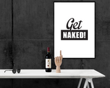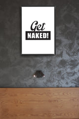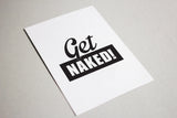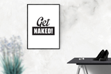 פוסטר מינימליסטי בעיצובי עם הכיתוב GET NAKED! בשחור לבן.