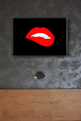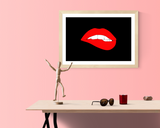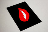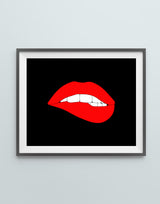 פוסטר בעיצוב מקורי שלי, בהשראת הפופ ארט, של נשיכת שפתיים אדומות על רקע שחור.