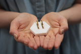 העגילים עשויים מפליז ומצופים זהב איכותי ללא ניקל בגימור מט. המוטות של העגילים שנכנסים לאוזן עשויים מכסף, ולכן היפואלרגניים, ומגיעים עם סוגרי סיליקון נוחים וחזקים.
