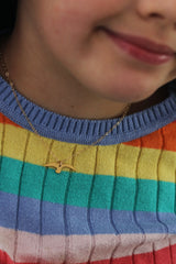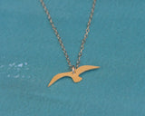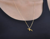 The pendant in the shape of a flying bird is made of brass and plated with high-quality gold (nickel-free) with a matte finish. The chain on which the pendant hangs is from Goldfield.