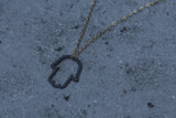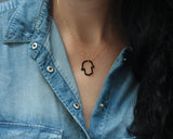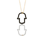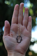 Gold filled necklace with delicate black Hamsa outline pendant. A necklace that will add a special touch to any everyday appearance.
