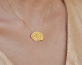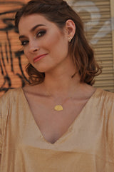 The pendant is made of brass and coated with high-quality and thick gold (nickel-free) with a matte finish. The chain on which the pendant hangs is from Goldfield.