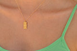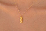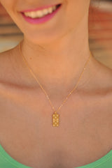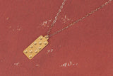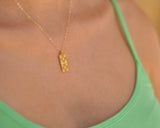 The pendant is made of brass, plated with high-quality nickel-free gold, and has a matte finish. The chain is made of gold-filled material, offering all the physical attributes of gold such as beauty, luxury, quality, strength, and durability over time.