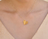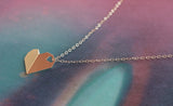 A necklace with a heart-shaped pendant that is folded in the middle and inside it is another small heart through which the chain passes.
