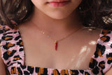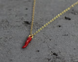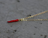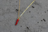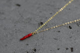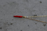 The chain is made of gold filled and the pendant is made of brass and coated with red enamel.