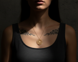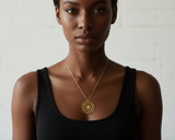 The pendant is made of brass and with a fine texture plated with high quality gold (without nickel) with a matte finish. The chain on which the pendant hangs is from Goldfield.