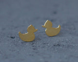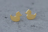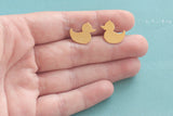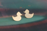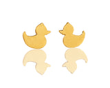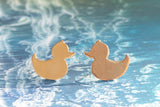 Rubber duck earrings attached to the ear in gold